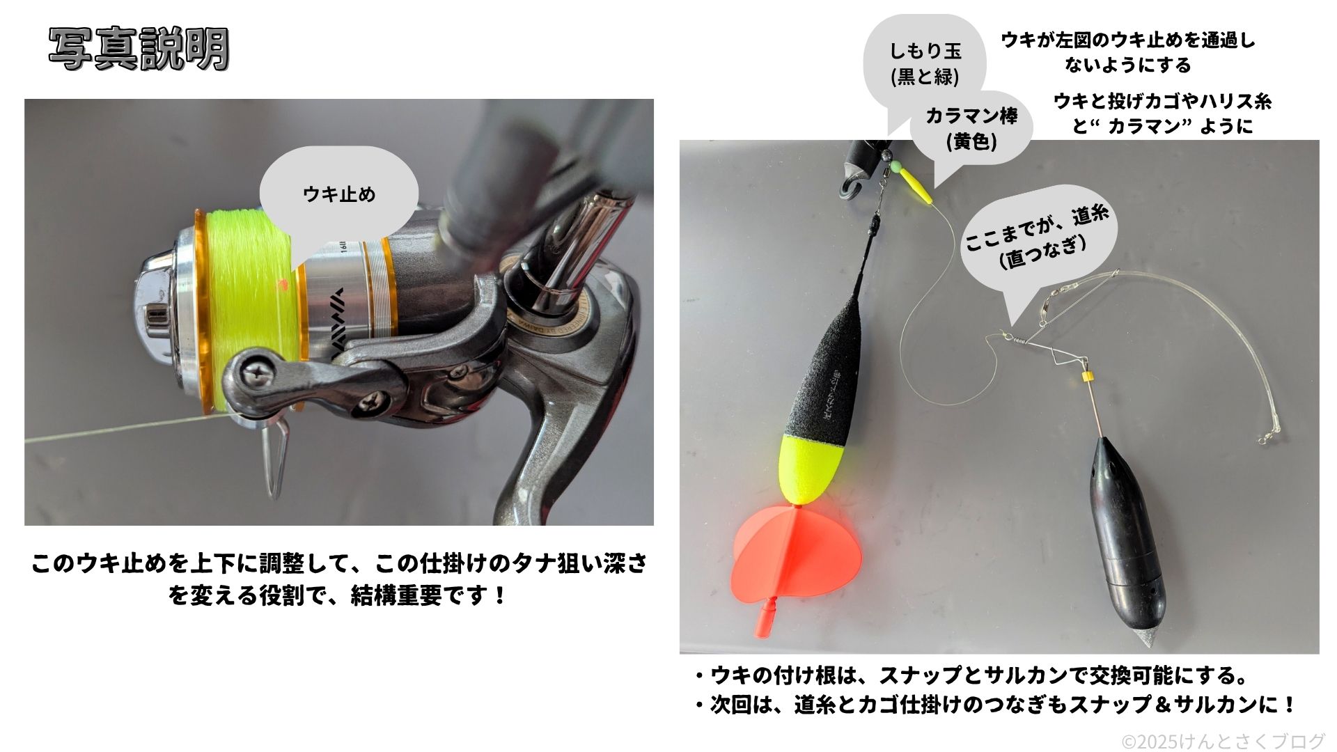 ウキ止めで深さを変えるだけで釣果が変わる。(釣り針の餌の残り具合等で判断) - かご餌詰め