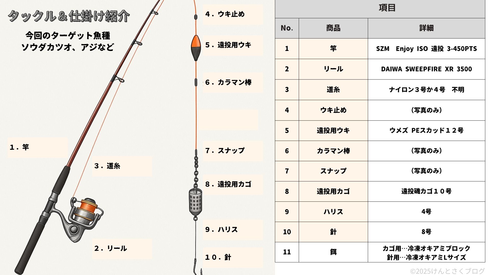 特にカゴにオキアミを詰める作業は、8割詰める感じでふわふわさせておく。 - キャスティング(投げ方)は練習あるのみ